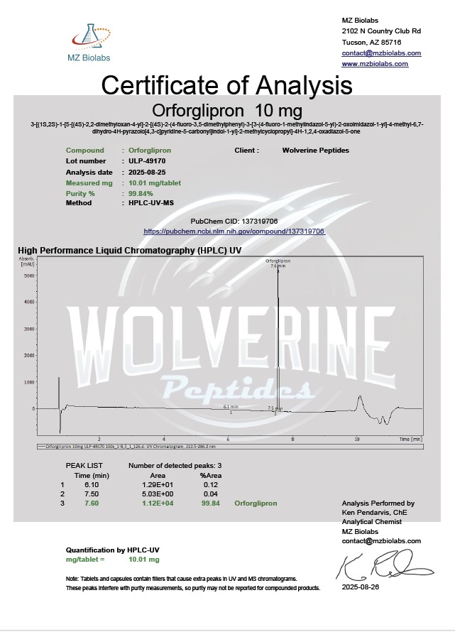 Orforglipron 10mg is now available at Wolverine Peptides. Each of our tablets are pre-measured to make your research easy and with less mess. Within each tablet there is 10mg of Orforglipron. Each bottle has a total of 30 tablets to provide multiple uses. Please keep each of our products securely stored in a cool location free of direct sunlight. All of our bottles are tamper-resistant and sealed at the manufacturing lab to ensure the utmost safety and quality.